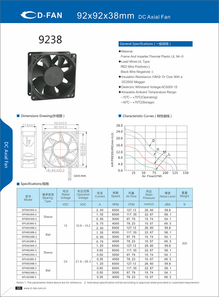 材料: 框架和葉輪:熱塑UL 94-0 引線.UL類型 紅色導(dǎo)線正極(+) 黑線負極(-) 絕緣電阻:10MΩ或以上,帶DC250V高阻表 介電耐壓:AC500V 1S 允許環(huán)境溫度范圍: -10℃-+70℃(運行) -40℃-+70℃(儲存)
