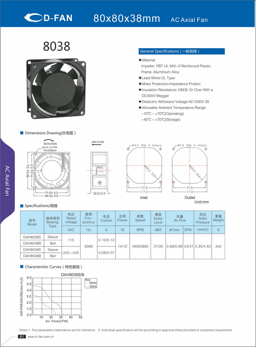 材料: 葉輪:PBT UL 94V-0增強(qiáng)塑料框架鋁合金 導(dǎo)線:UL型 電機(jī)保護(hù):阻抗保護(hù) 絕緣電阻:1歐姆或以上,帶DC500V高阻表 介電耐壓:AC1500V 3S 允許環(huán)境溫度范圍: -10℃-+70℃(運(yùn)行) -40℃-+70℃(儲存)